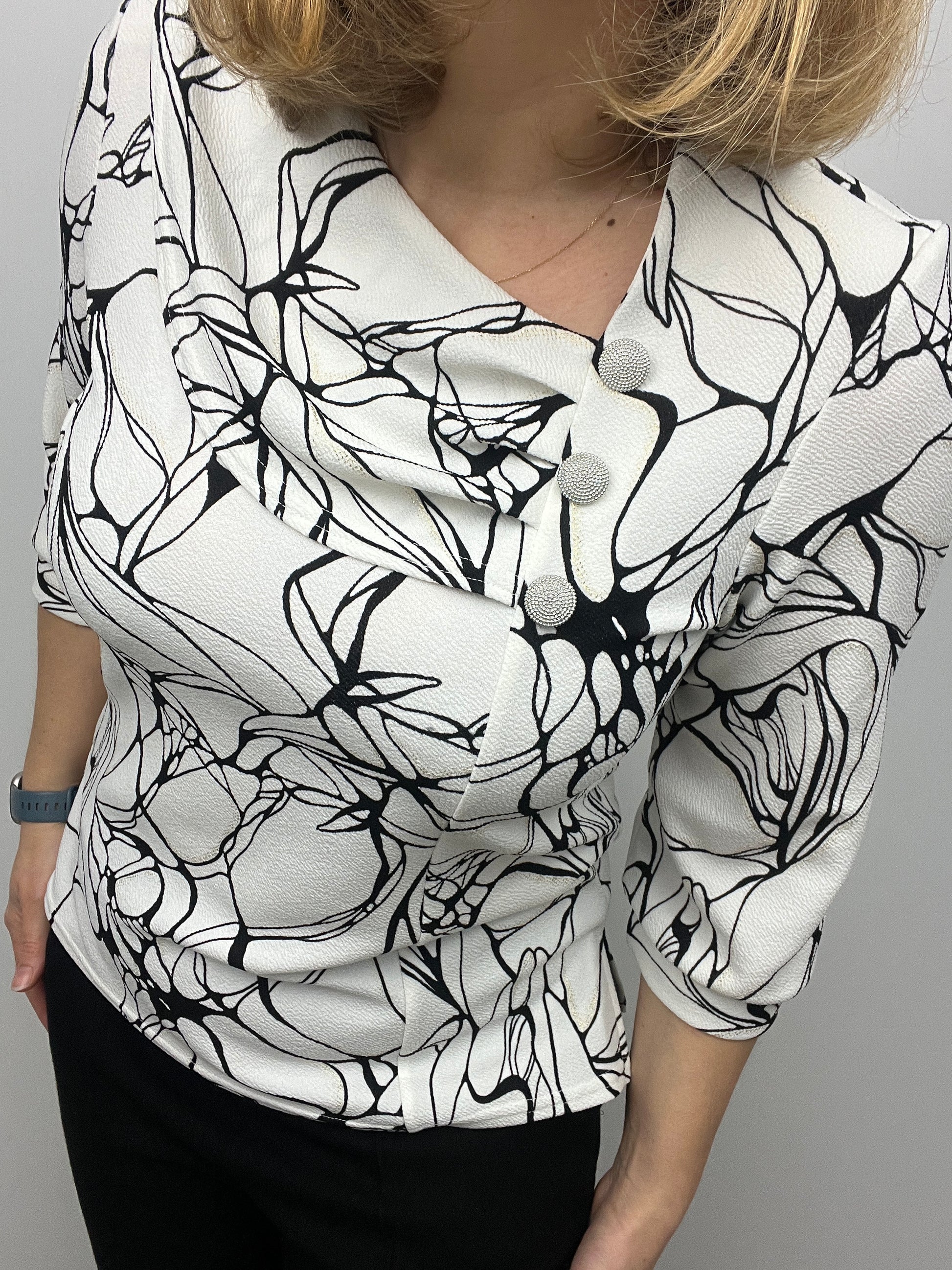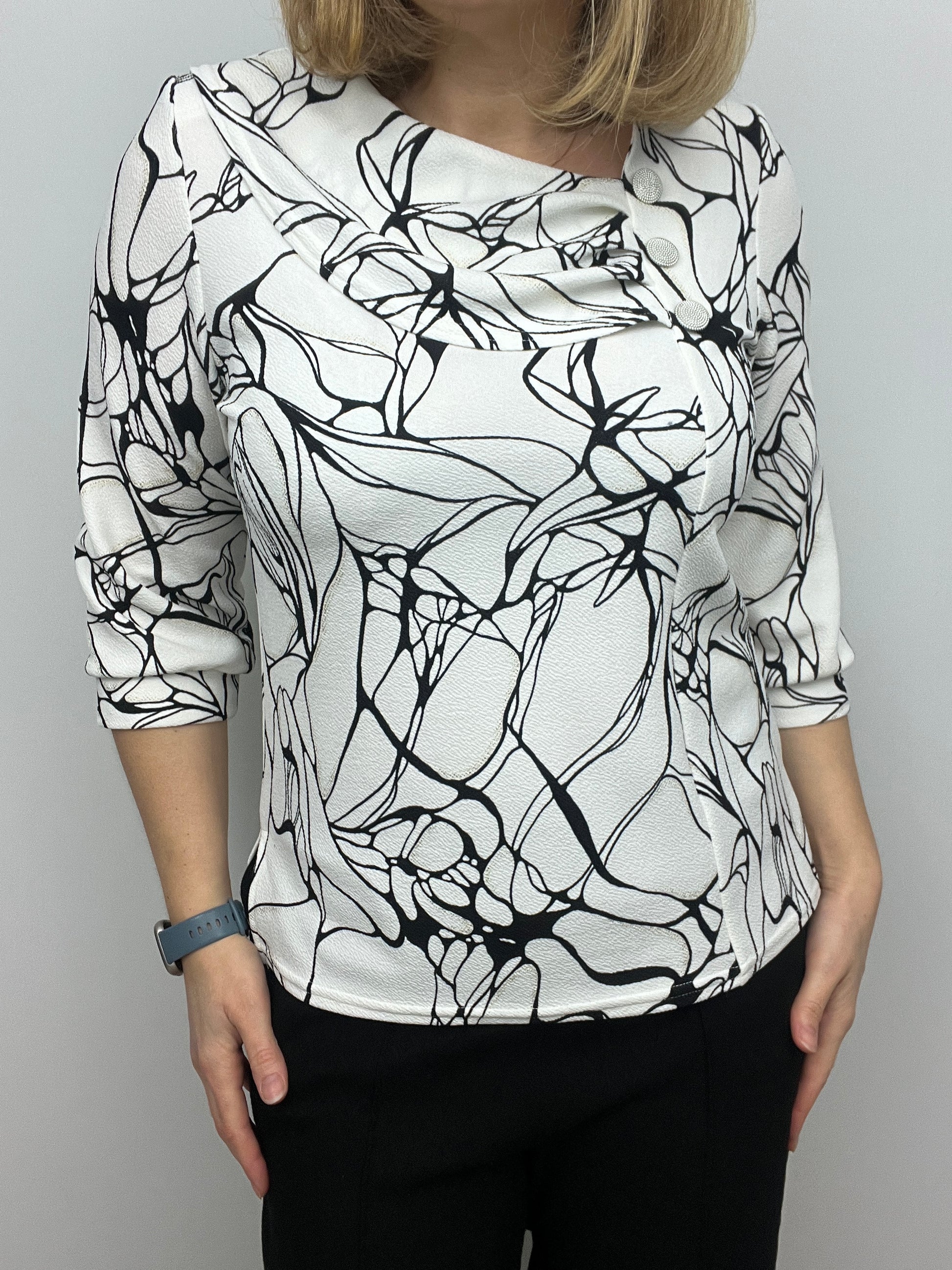 A striking monochrome top featuring a soft ivory background with an artistic blacck print. The standout detail is the beautifully draped pleated cowl-style neckline, finished with three decorative textured buttons.