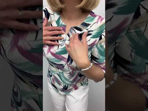 Add a pop of artistic flair to your wardrobe with this vibrant brushstroke print top. This Bella top features a comfortable lightweight stretchy fabric in bold swirls of teal, plum, cream, navy and soft beige on white background. It boasts an elegant mini-V neckline, shoulder pads, and 3/4 sleeves for a sophisticated look.