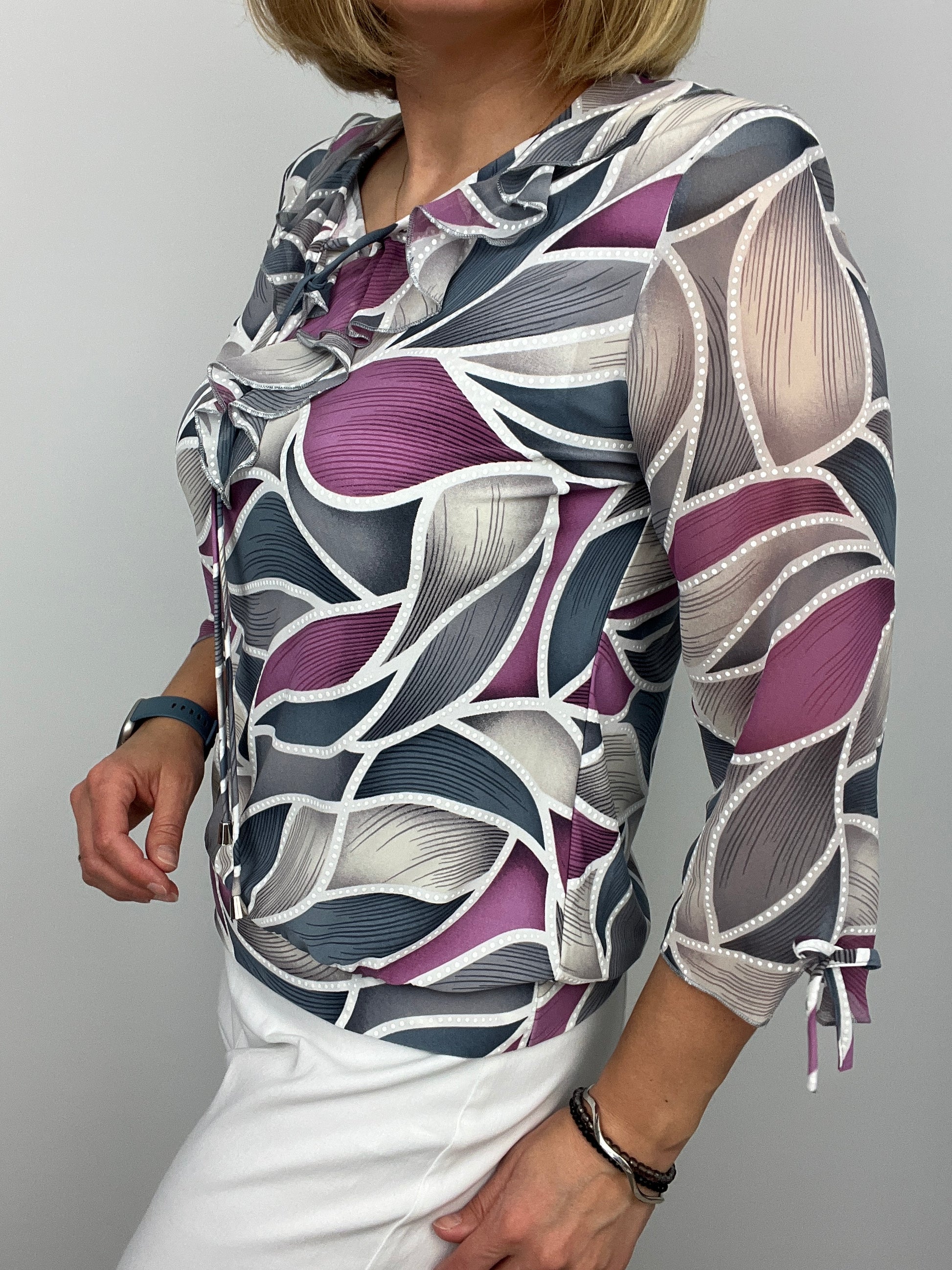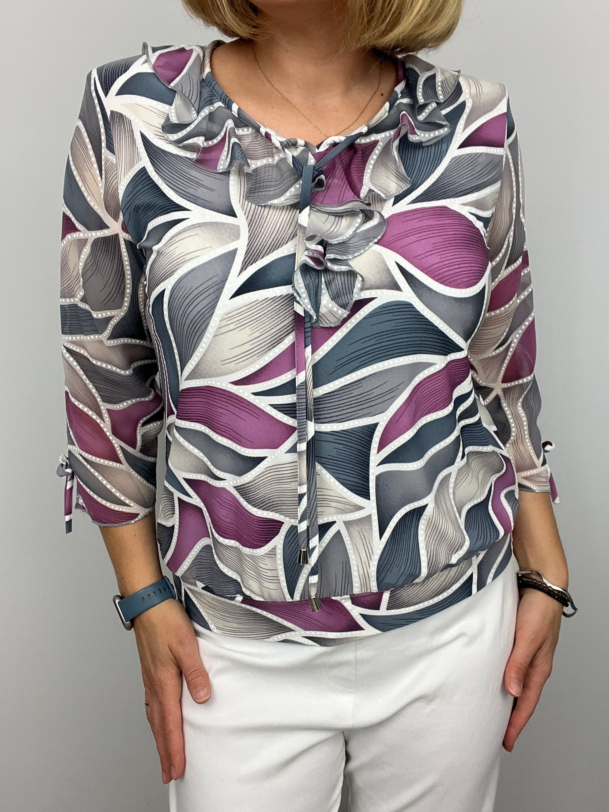 Beautiful, quality top with chiffon ruffle neckline with free falling downstrings. Wide band at the bottom hem and 3/4 chiffon sleeves finished with decorative slit and little bow detail. It's both elegant and versatile, making it an ideal choice for both formal and casual events.