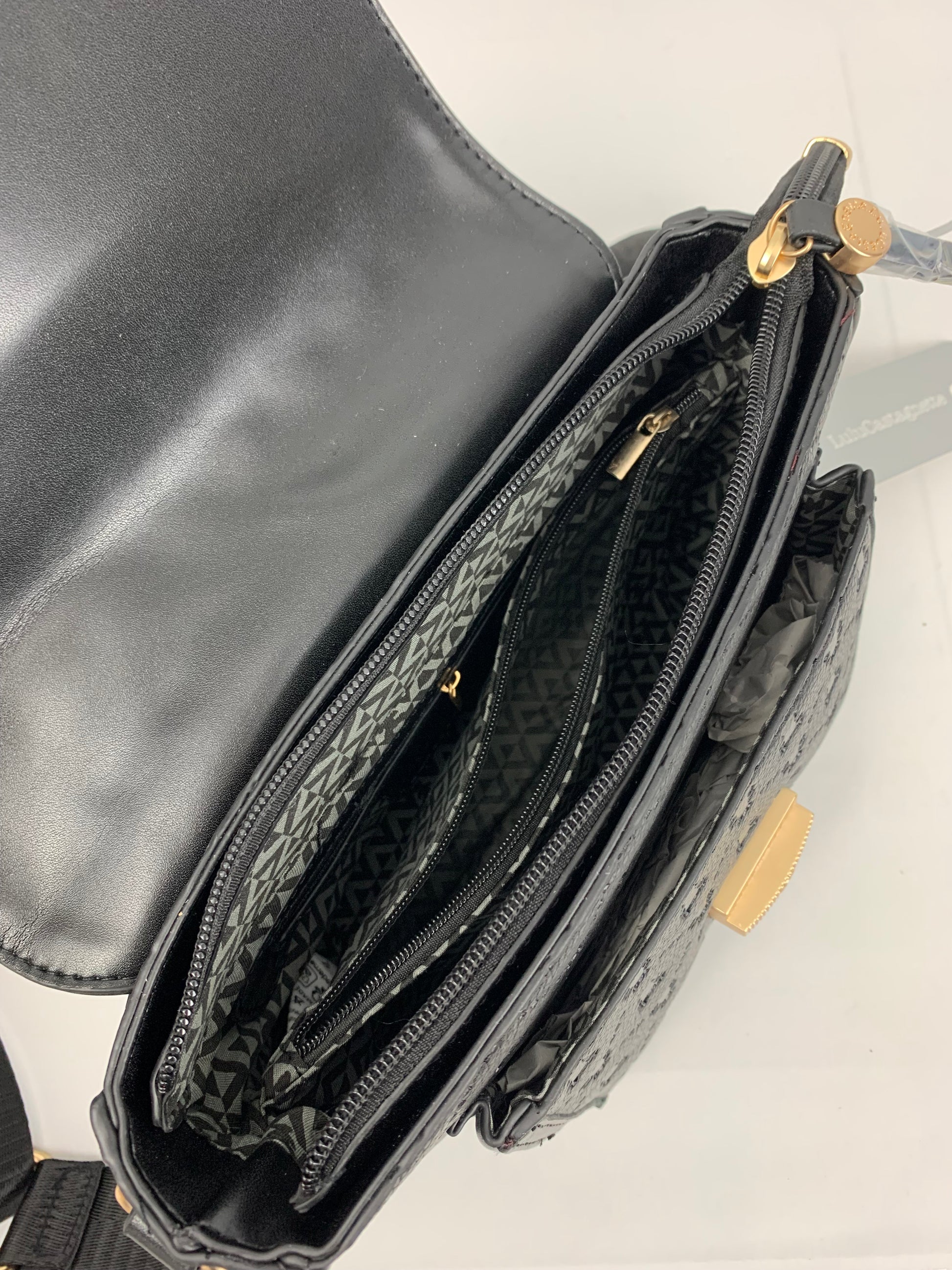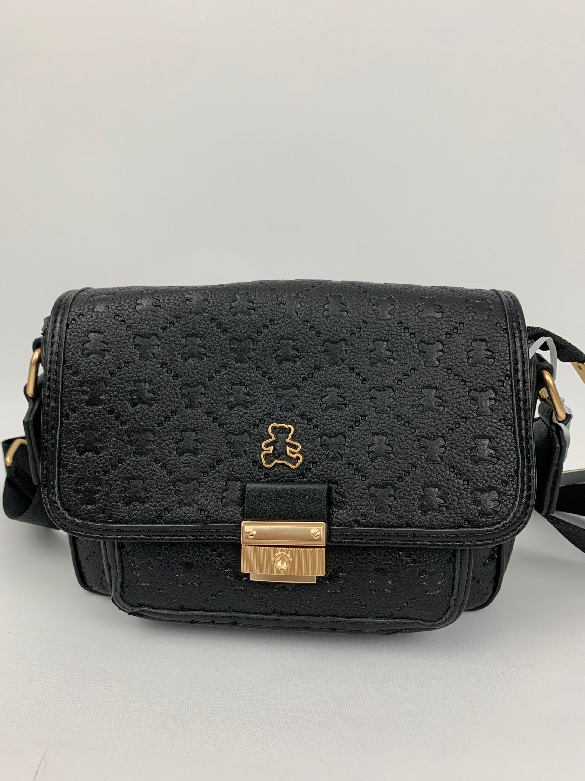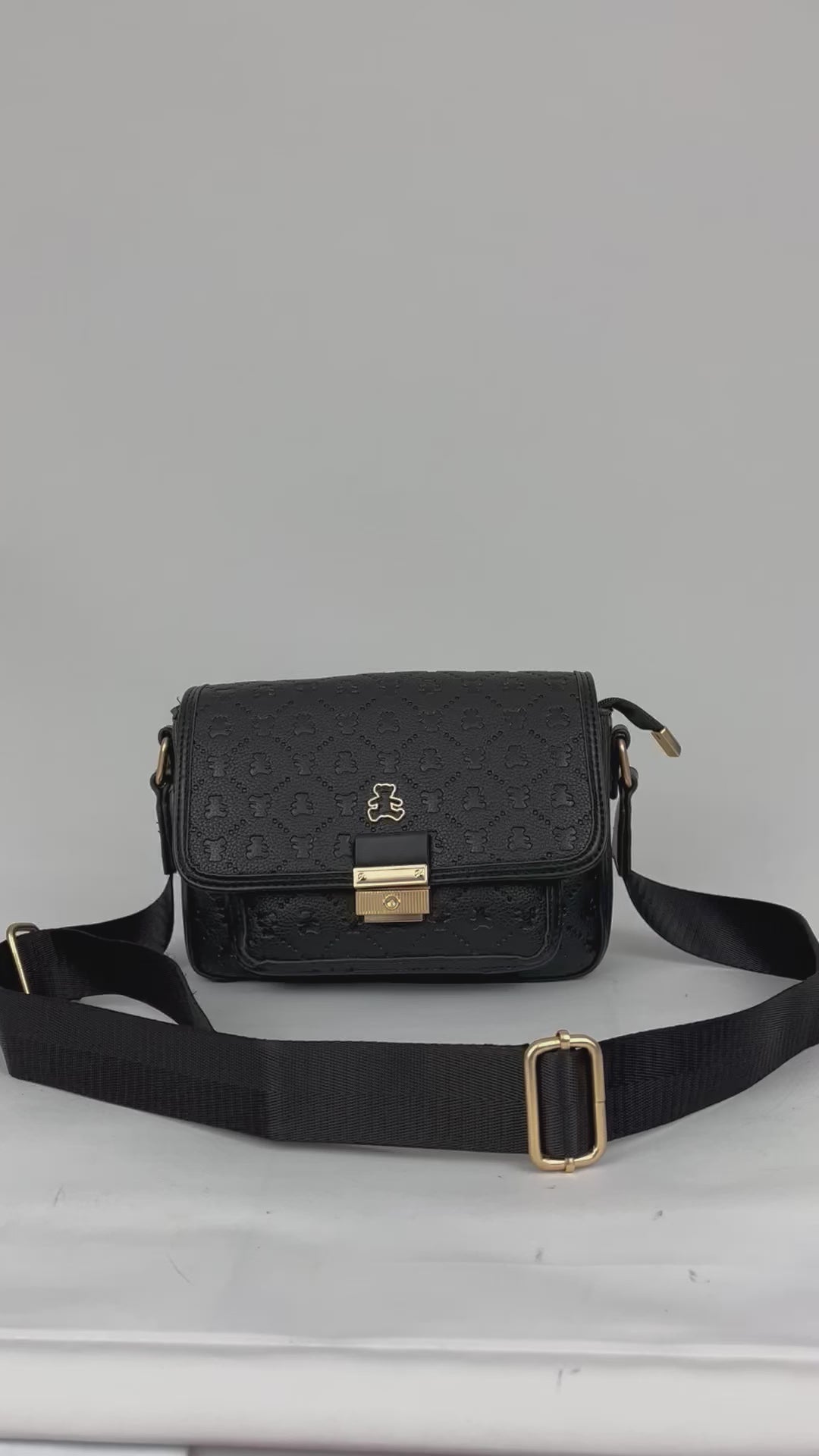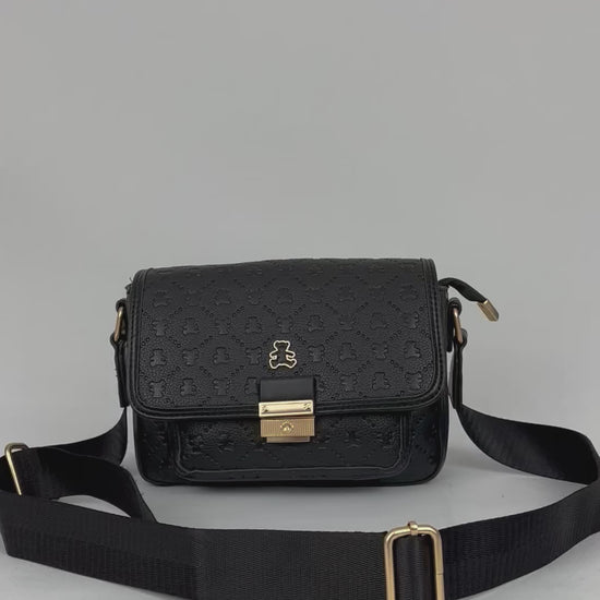This FLORENCE crossbody bag is made of high-quality vegan faux leather and features a unique teddy leather design, a signature of the LuluCastagnette brand. The black exterior is complemented by a patterned fabric interior and a wide fabric strap. It also includes multiple pockets for easy organization, such as an external pocket on the back and one hidden under the flap, as well as internal pockets including a zipped divider, a zipped pocket, and an open pocket.