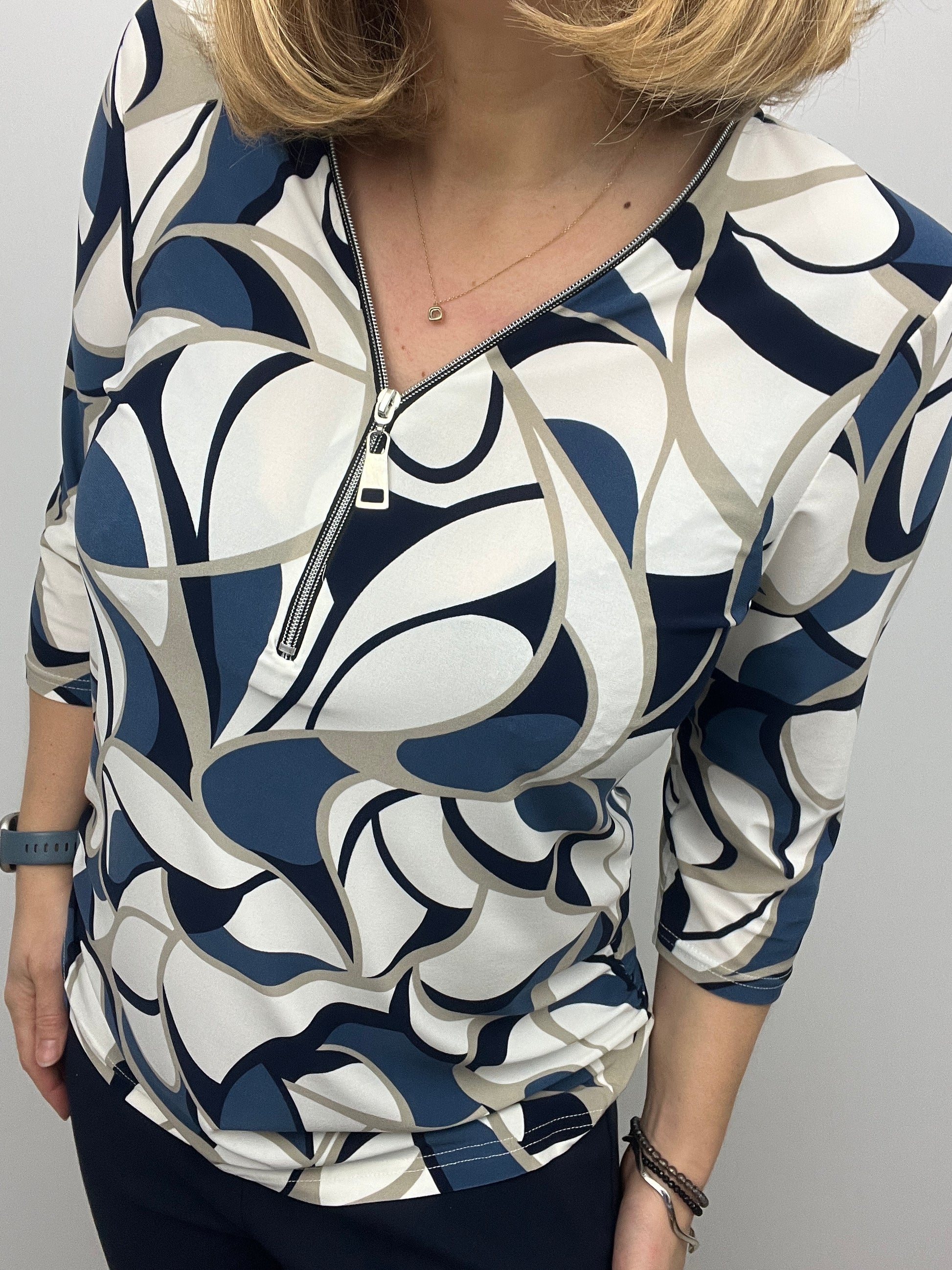 This lovely zip top features a striking abstract print in a beautiful, calming blend of French blue and warm  taupe set agains a soft light background.