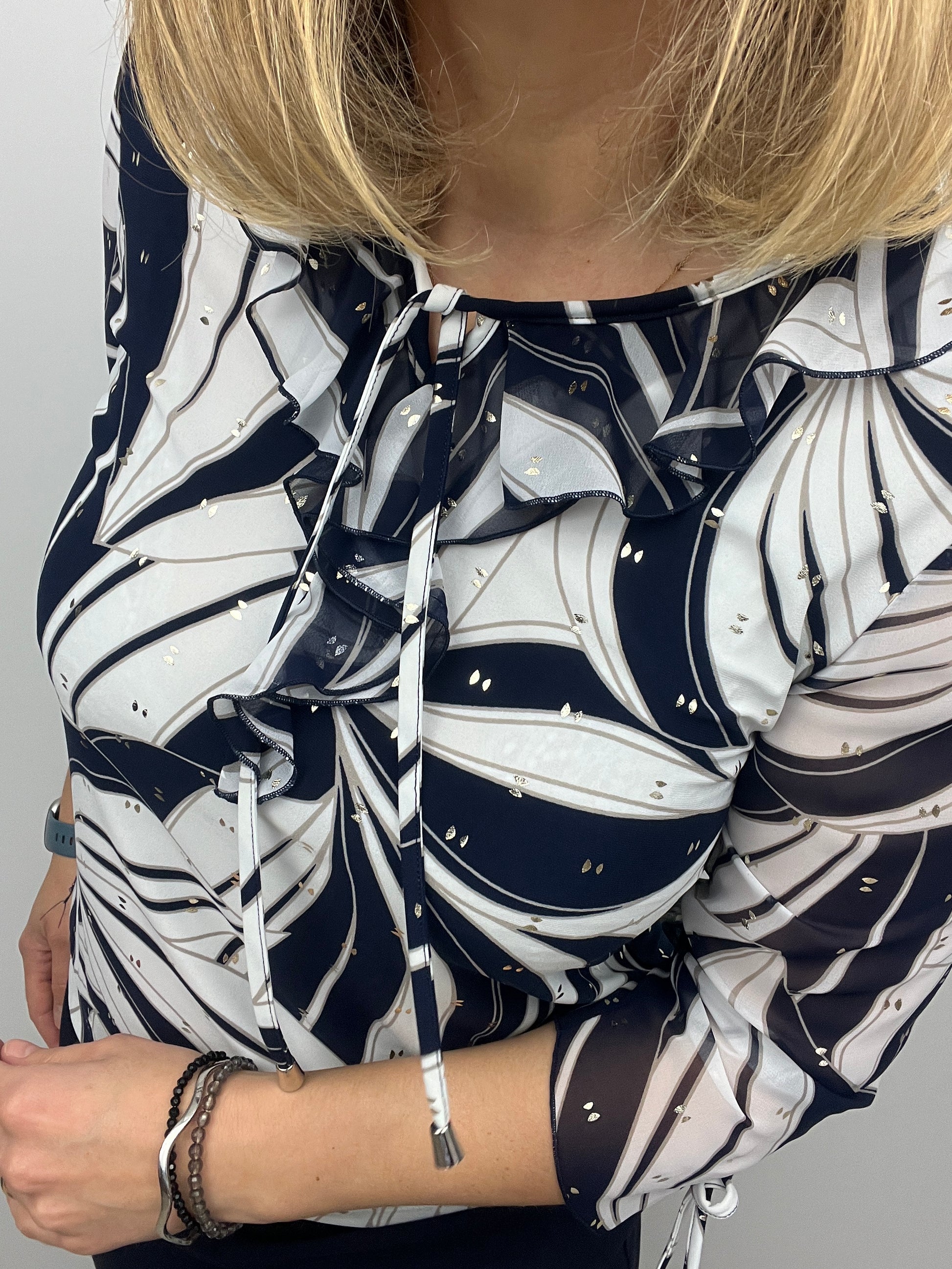 This ruffle top is a stylish and feminine piece designed with a flattering chiffon ruffle neckline with tie detail that adds a soft, elegant touch. Wide band at the bottom hem and 3/4 chiffon sleeves finished with decorative slit and little bow accent add a delicate detail while keeping the look light and airy. The quality stretchy fabric features an abstract print in timeless mix of navy and white with a subtle touch of taupe. Subtle touches of metallic gold add a hint of shimmer throughout the design, catching the light beautifully. This top pairs beautifully with trousers or skirts, making it a perfect for both day and evening wear.