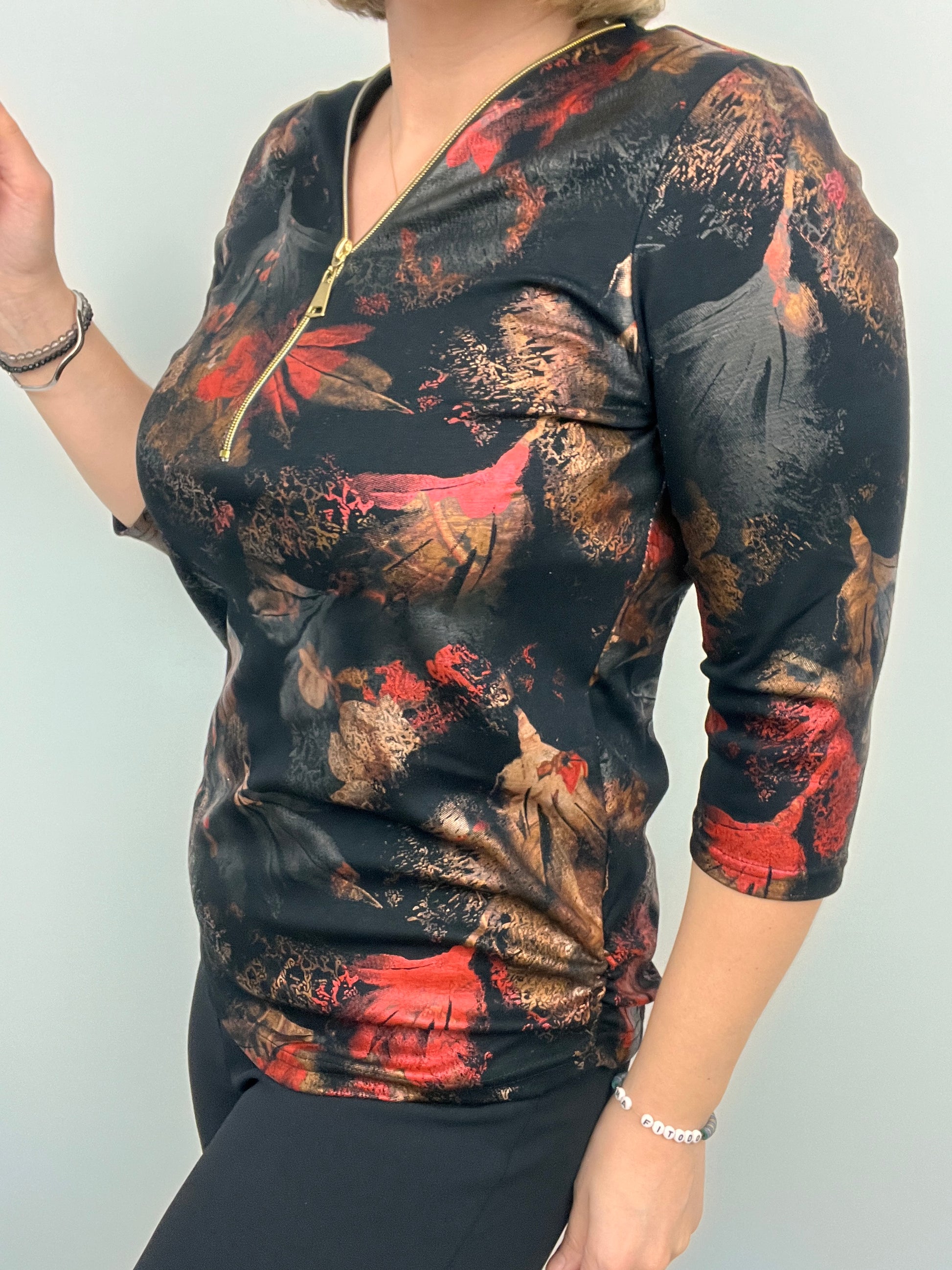 The GWEN zip top is made of the lovely winter weight fabric, is black based with rich and shiny golden with red print. Great top fir the festive season.