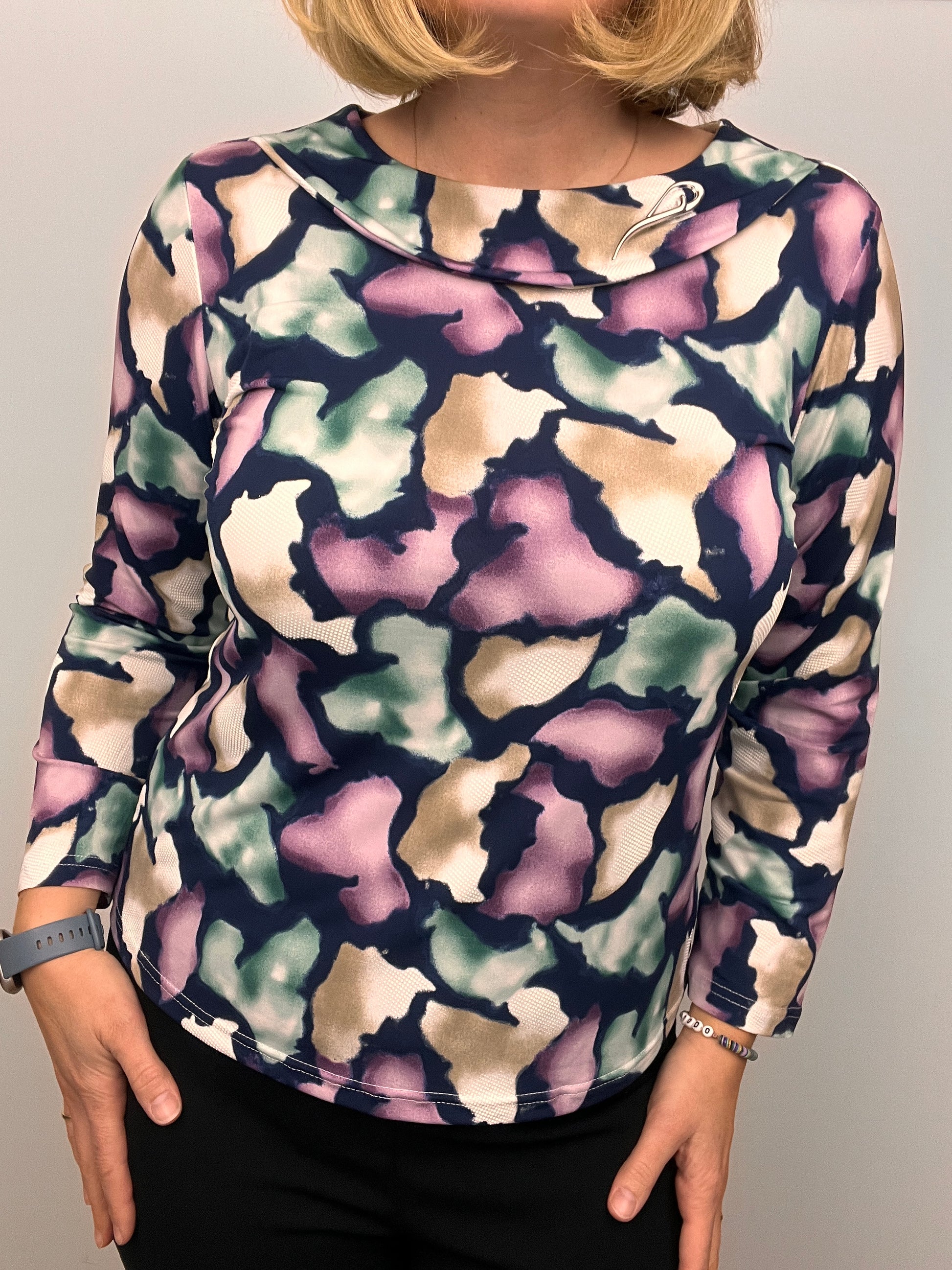 This HARMONY top boasts stunning, vibrant colors - a beautiful combination of plum, taupe, green, cream and navy. Its elegant flat cowl neckline is adorned with a detachable brooch for an added touch of sophistication.