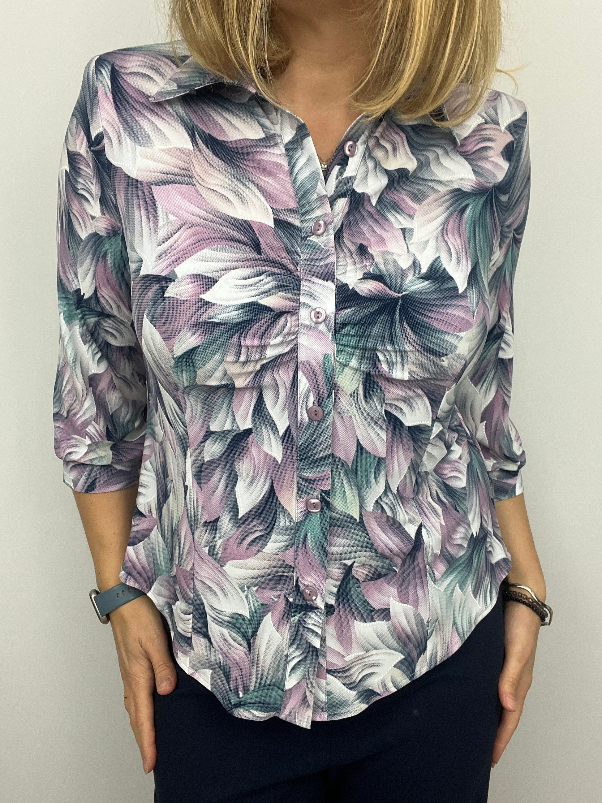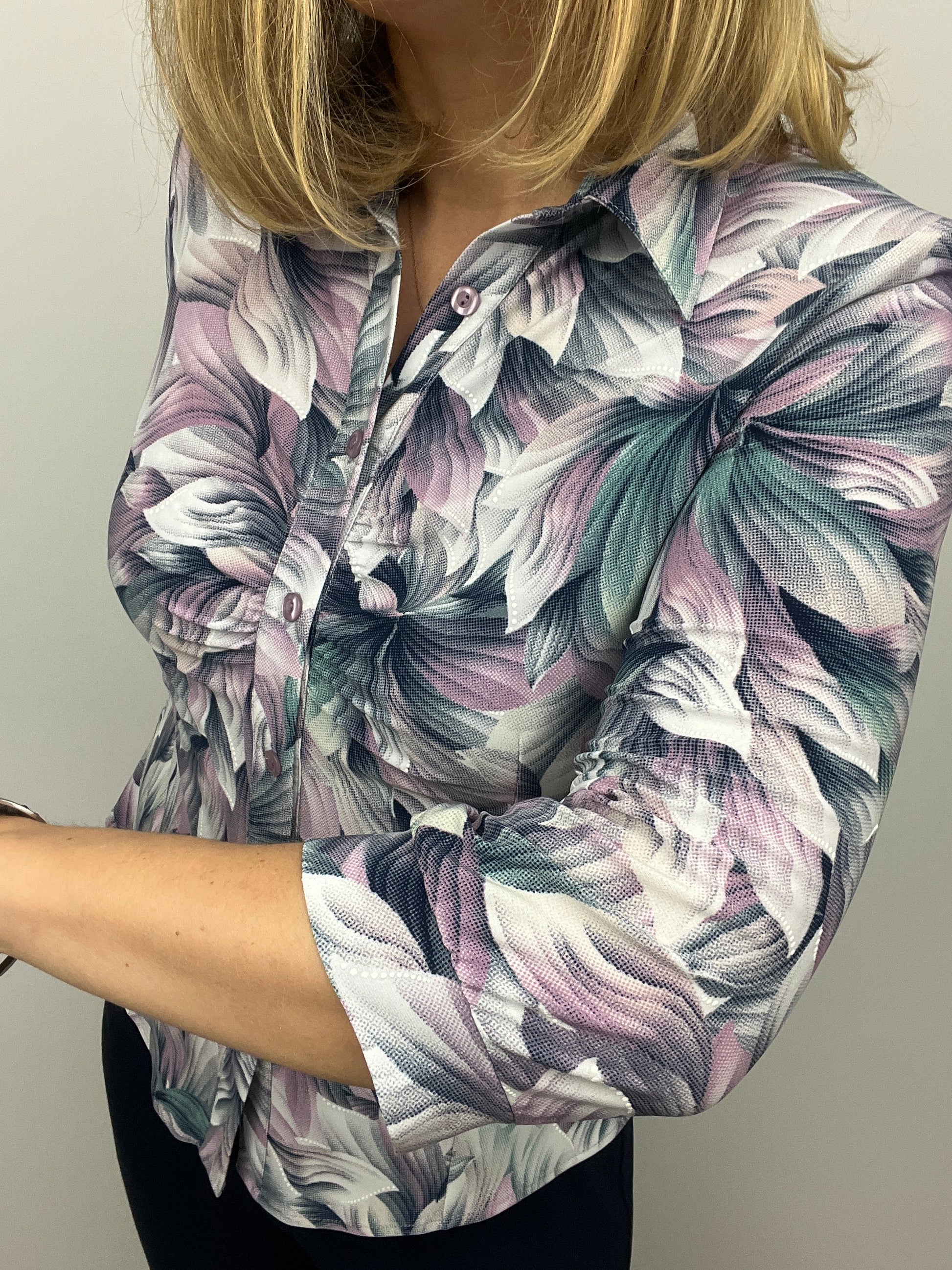 A key design detail is the ruching at the bust line, which is an extra advantage you won't find everywhere. This clever detail keeps the buttons sitting neatly in place, with no pulling as you move. A blouse that fits well and stays comfortable all day! It has 3/4 sleeves with cuffs and its slightly shorter length at the bottom sides help create a slimming effect for longer-looking legs.