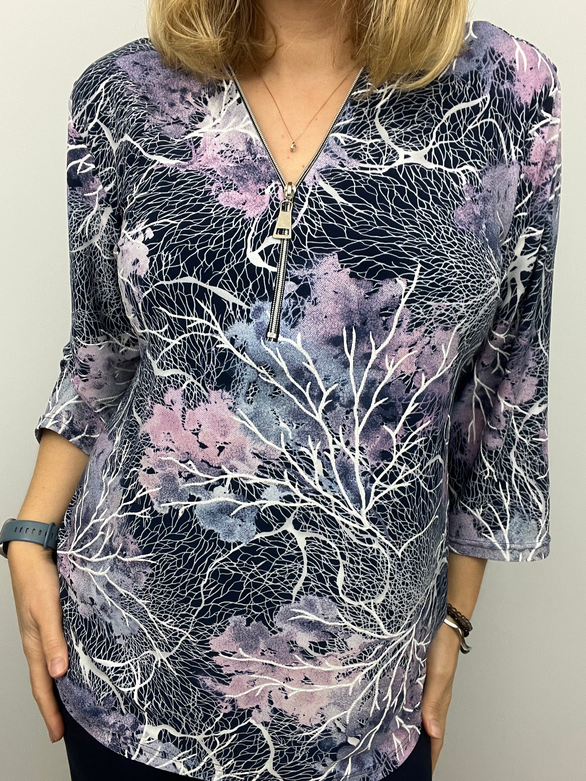 A gorgeous zip top in a soft navy base with a delicate mix of lilac, pink and white tones - the pattern looks like fine branches and soft blooms intertwined, giving it a truly elegant and unique look. This is a lovely zip top in a flattering V-neck shape finished with a golden zip detail. The zip at the  neckline is fully functional and you can pull it up or down. The top features 3/4 sleeve length and is ruched on sides for that perfect fit around your waist.