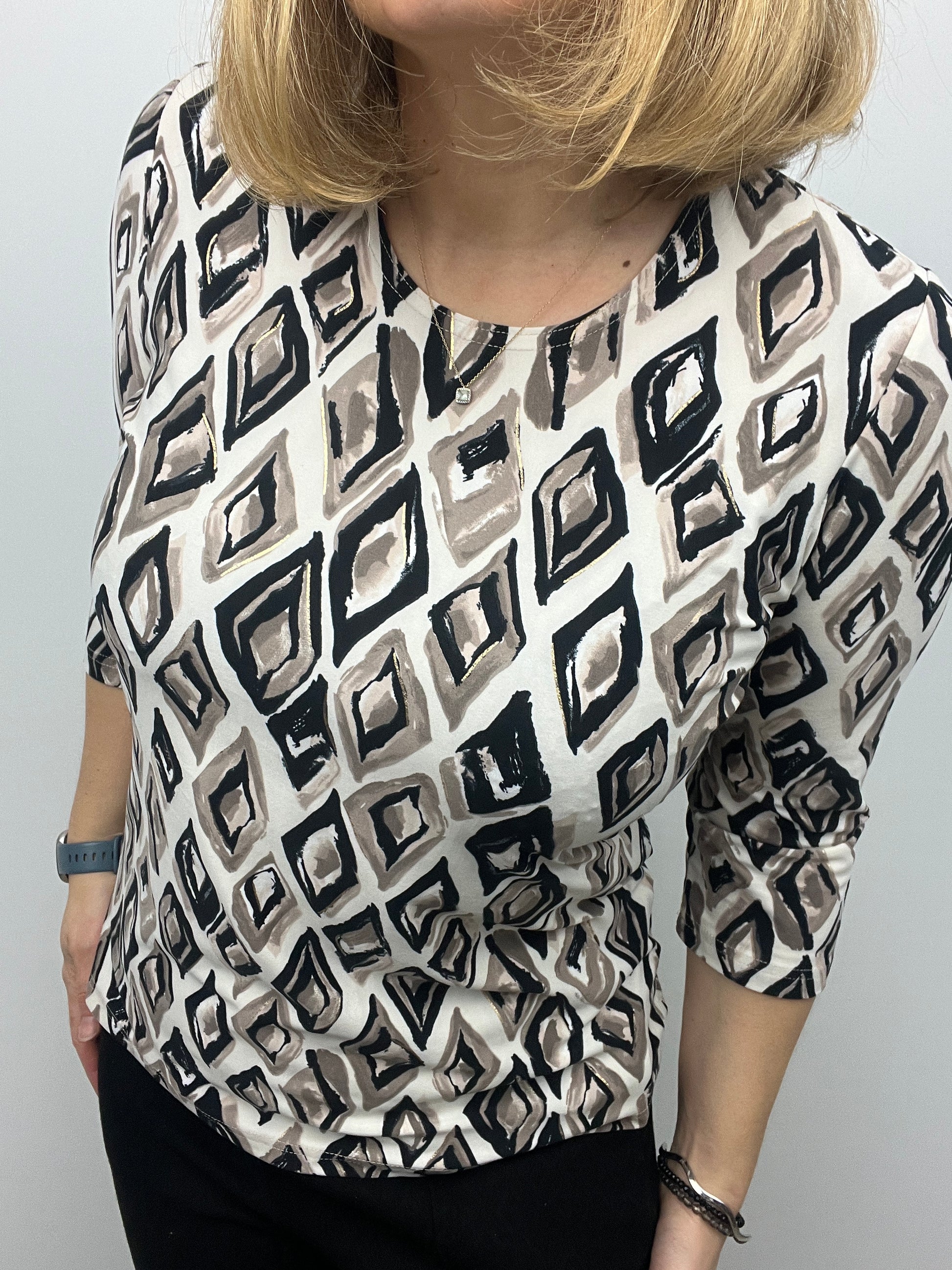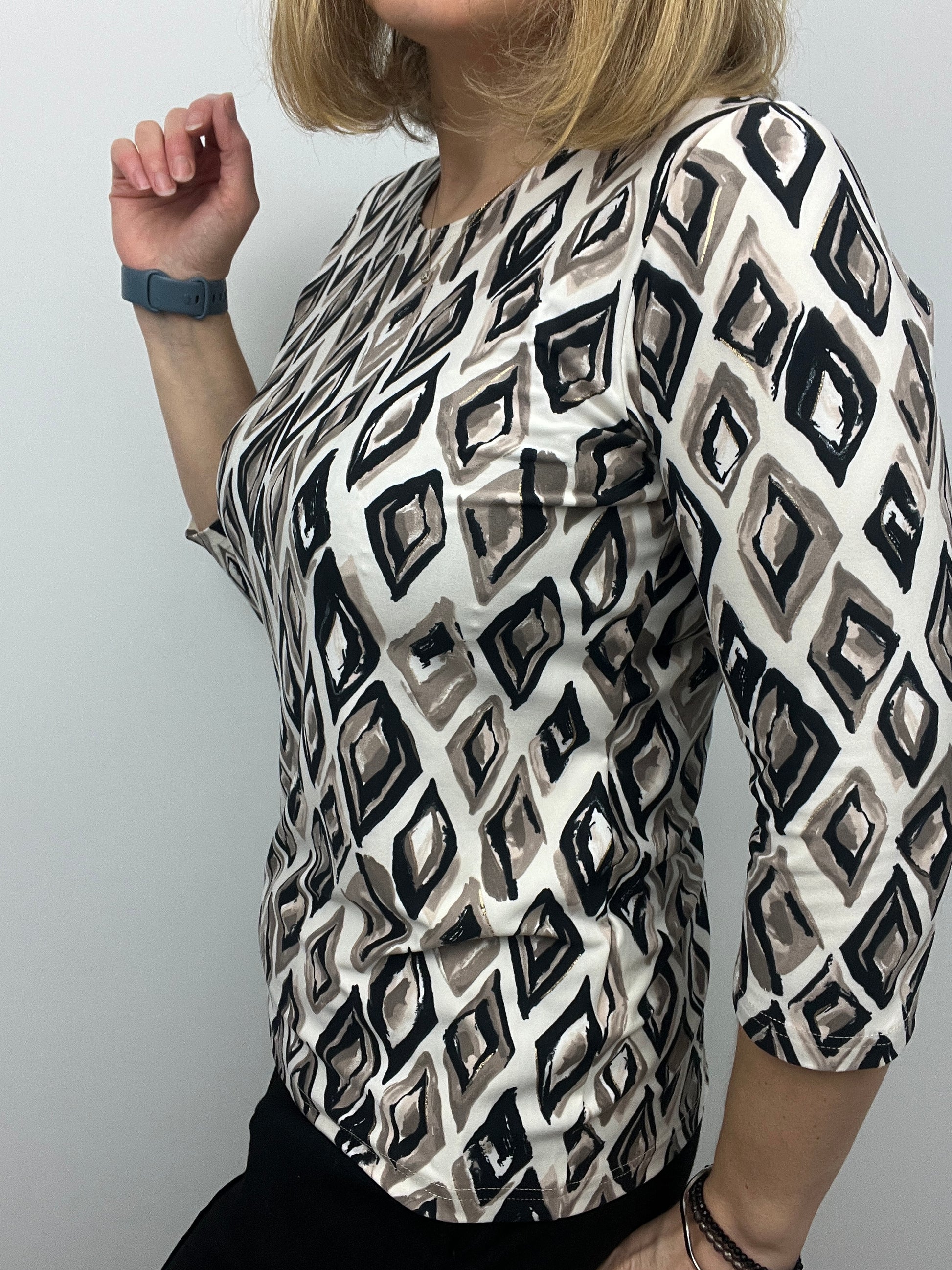 Beautiful effortlessly stylish geometric-print top. designed with modern diamond pattern in soft neutral tones of beige, taupe and black, it offers a sophisticated yet versatile look that pairs beautifully with both casual and dressier pieces.