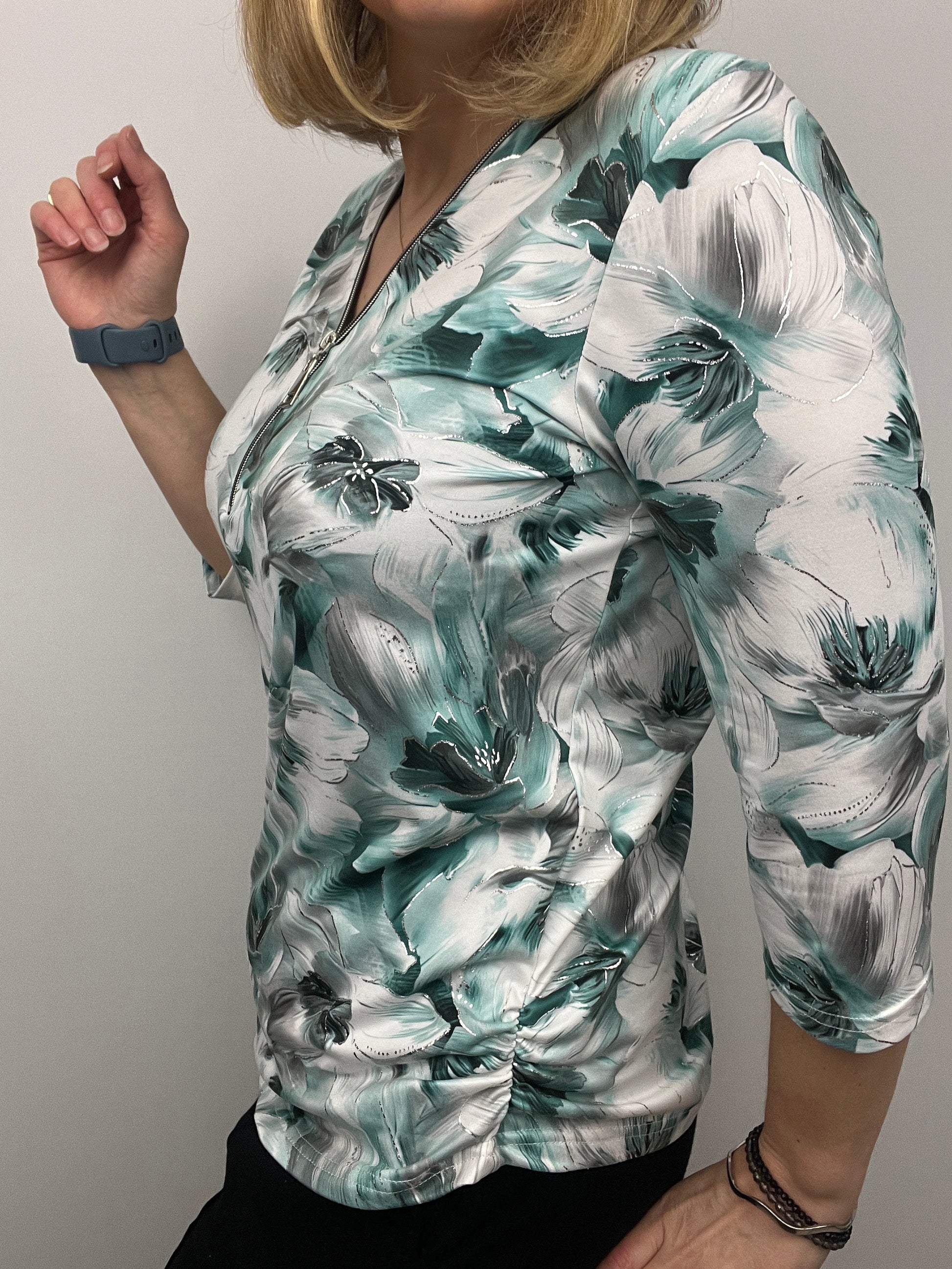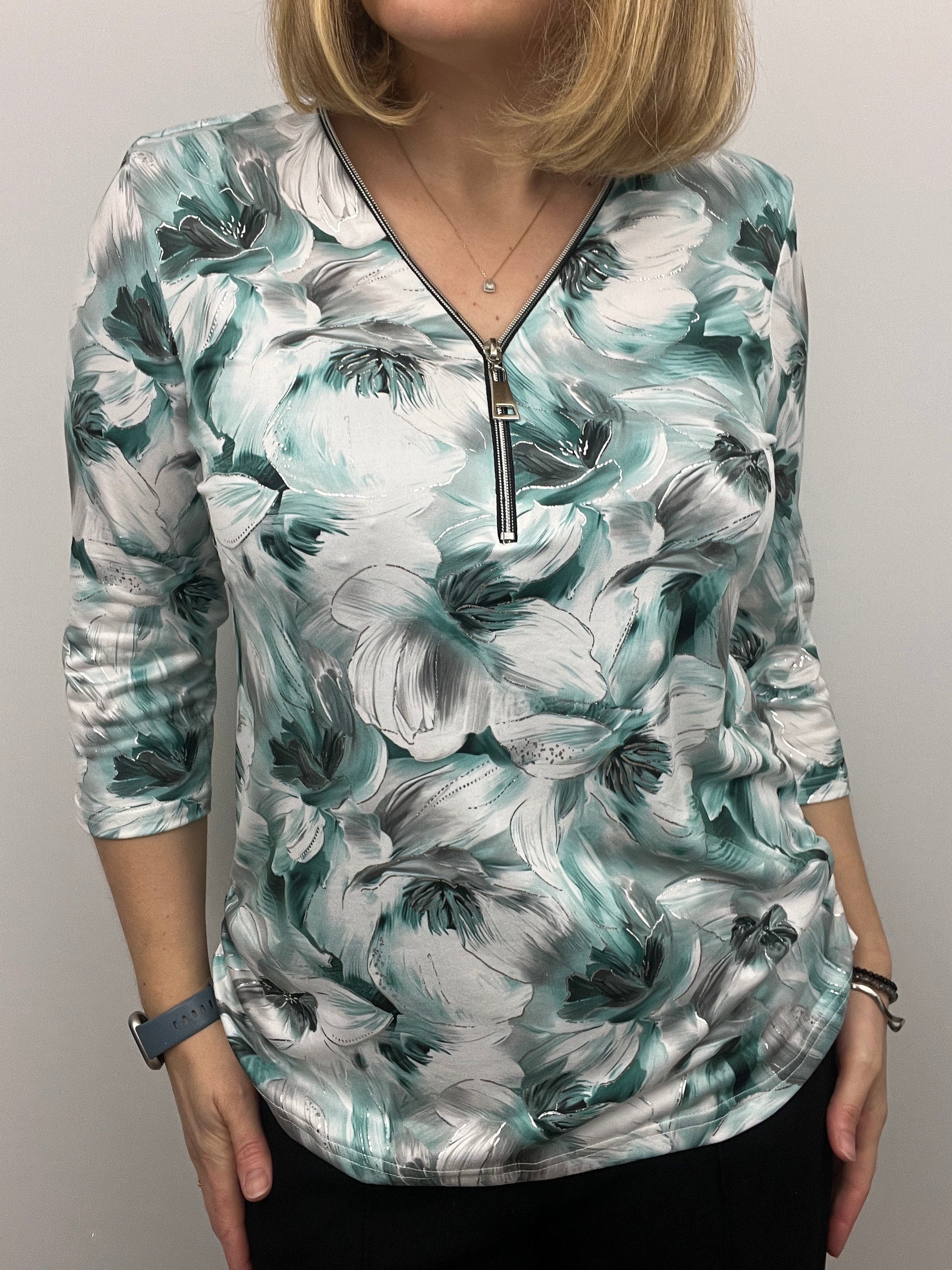 This stunning zip top features a soft, flowing floral print in beautiful shades of teal, sage and soft grey on a light background. It features a flattering V-neckline with a statement silver zip detail that adds a modern touch to this feminine design.