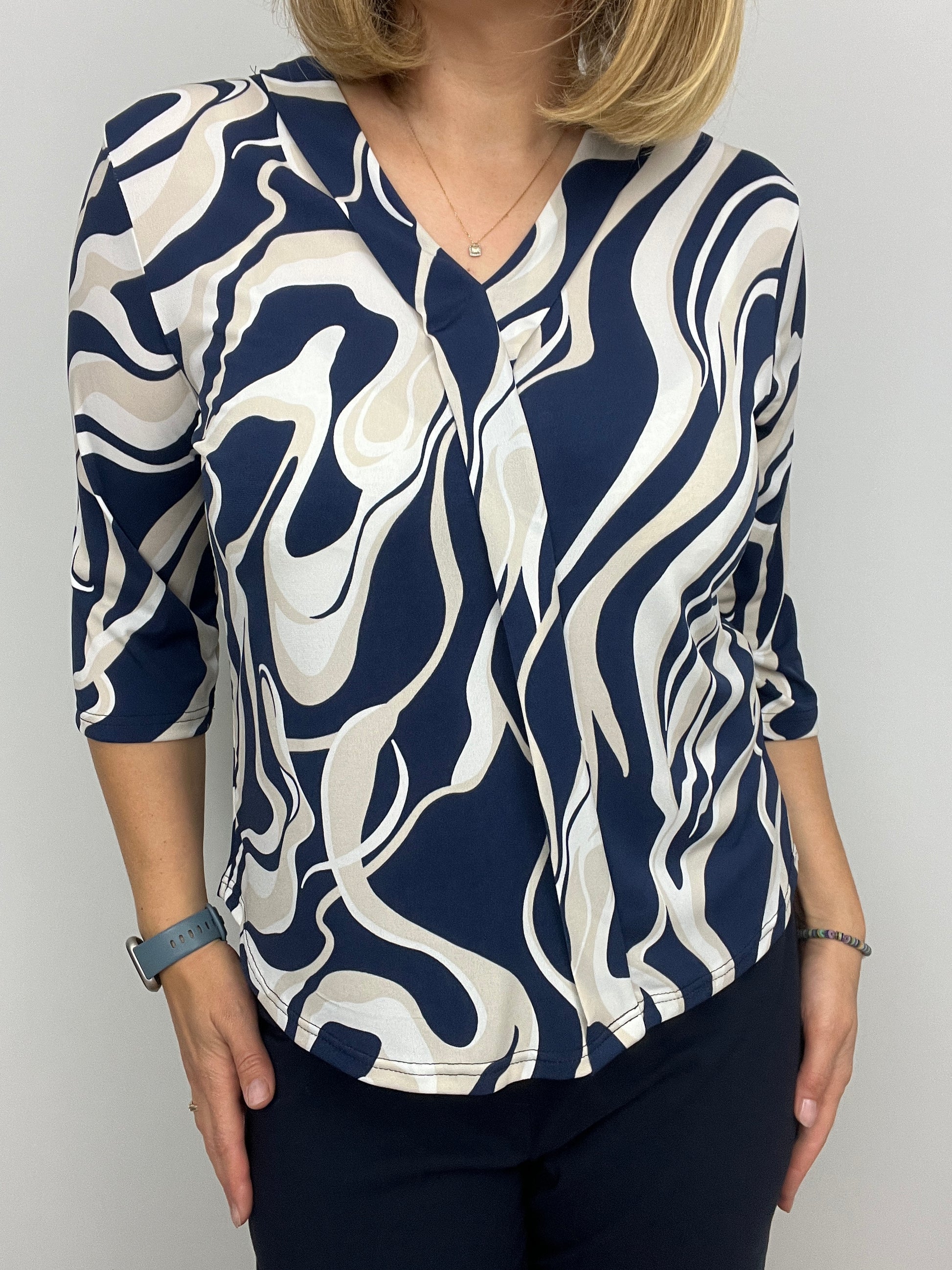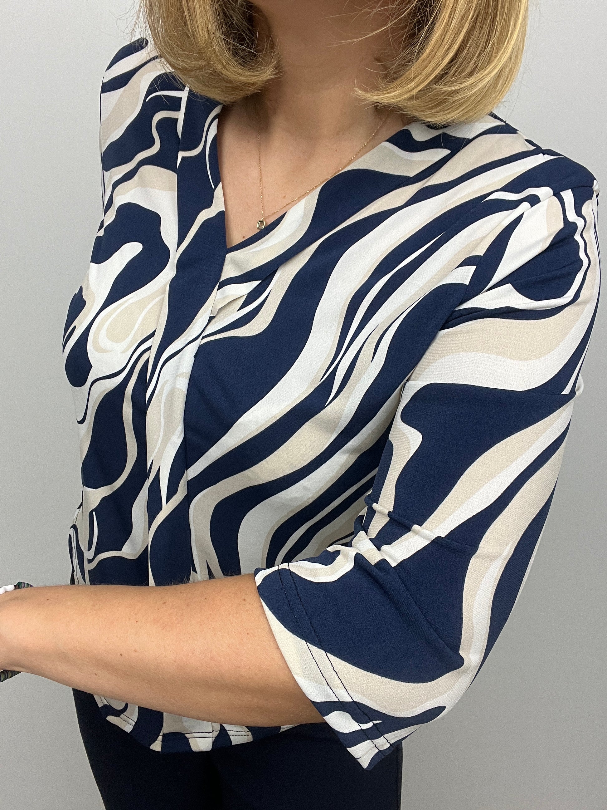 This stylish top showcases a diagonal swirly pattern in timeless navy, cream and white. The flattering V-shaped neckline is finished with a patterned trim that continues smoothly along the front. Pair it with your favourite trousers or skirt for a fresh modern, look.