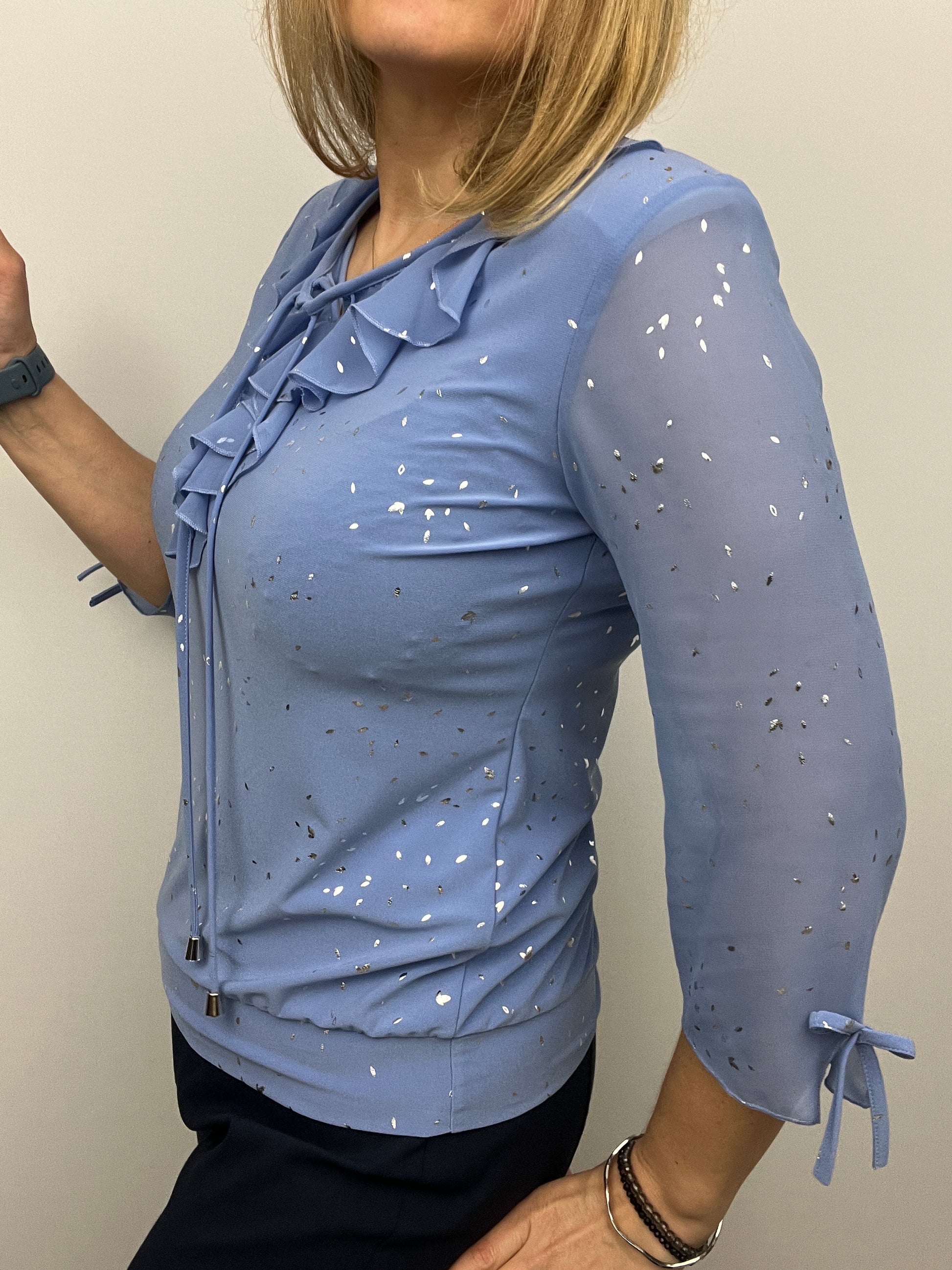 The LANA in this beautiful soft cornflower blue is a stylish and feminine piece designed with a flattering chiffon ruffle neckline with tie detail that adds a soft, elegant touch. Wide band at the bottom hem and 3/4 chiffon sleeves finished with decorative slit and little bow accent add a delicate detail while keeping the look light and airy. The quality stretchy fabric features a delicate silver shimmer accents, giving it just the right amount of sparkle without being overpowering.