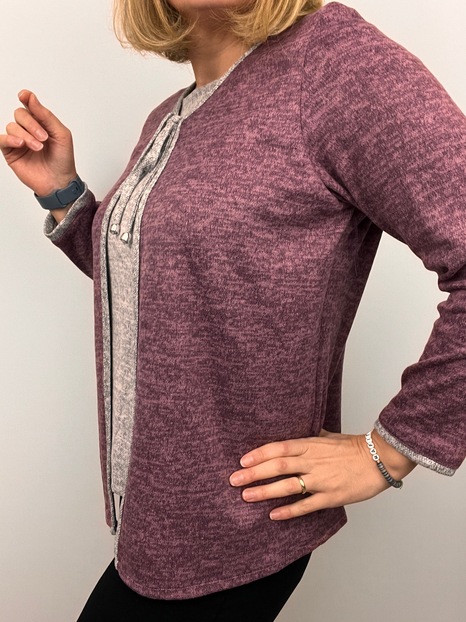 Looking for a cozy top to keep you warm all day? Look no further than the MARIA warm fine knit twin-set effect winter top in dark pink melange. Complete with a silver trim and matching silver top underneath (all stitched together in one part), this top has you covered.