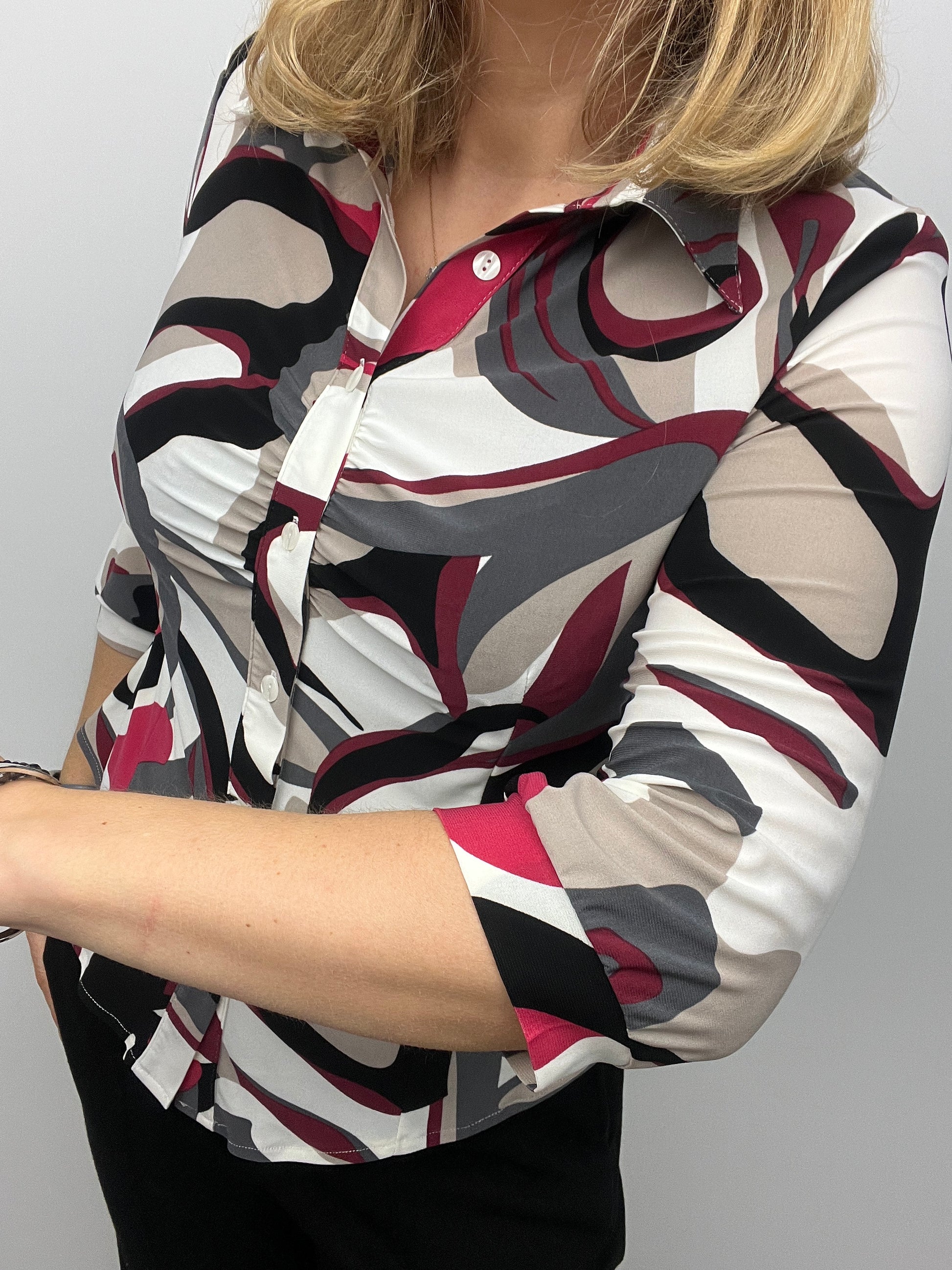 A beautiful blouse in abstract print in tones of burgundy, raspberry red, grey, white, taupe and black. A key design detail is the ruching at the bust line, which is an extra advantage you won't find everywhere. This clever detail keeps the buttons sitting neatly in place, with no pulling as you move. A blouse that fits well and stays comfortable all day! It has 3/4 sleeves with cuffs and its slightly shorter length at the bottom sides help create a slimming effect for longer-looking legs.