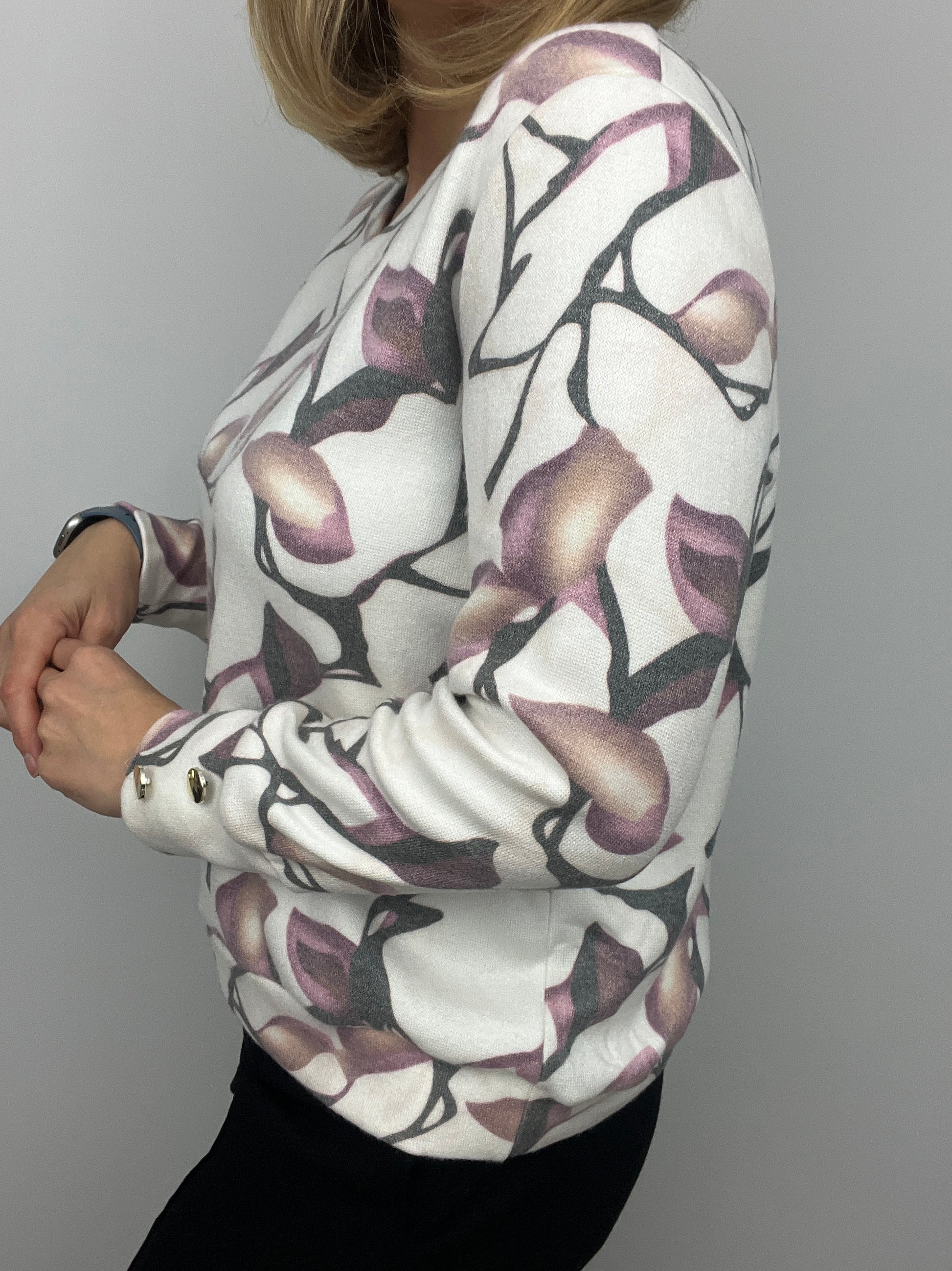 This beautiful soft knit jumper features an elegant floral print in shades of mauve, plum and cream on an ivory background. The gentle V-neckline and relaxed fit makes it both  flattering and comfortable to wear. Crafted from a luxuriously soft knit, it's perfect for layering or wearing on its own through the seasons. Wide cuffs with two subtle button details add a touch of sophistication.