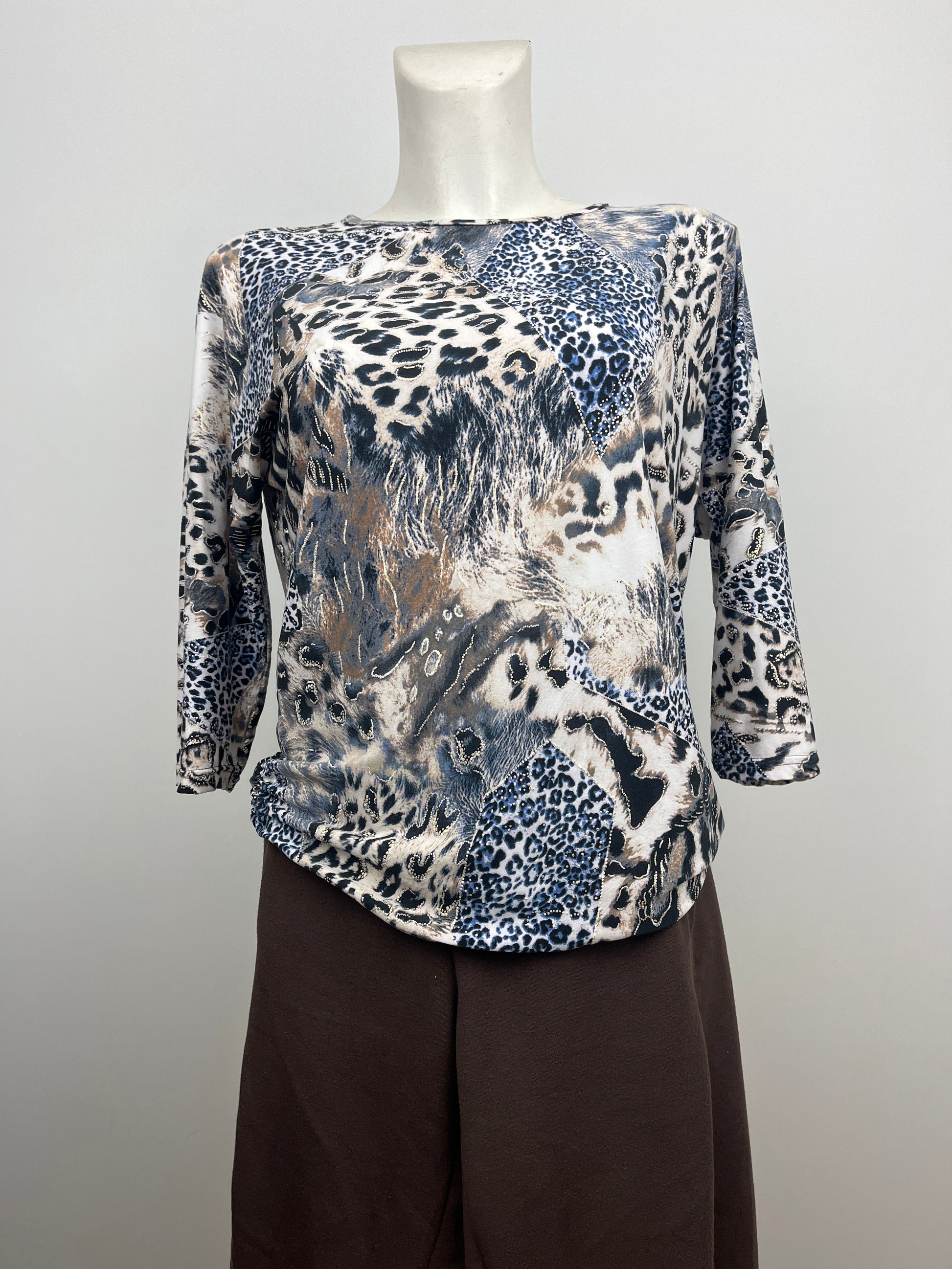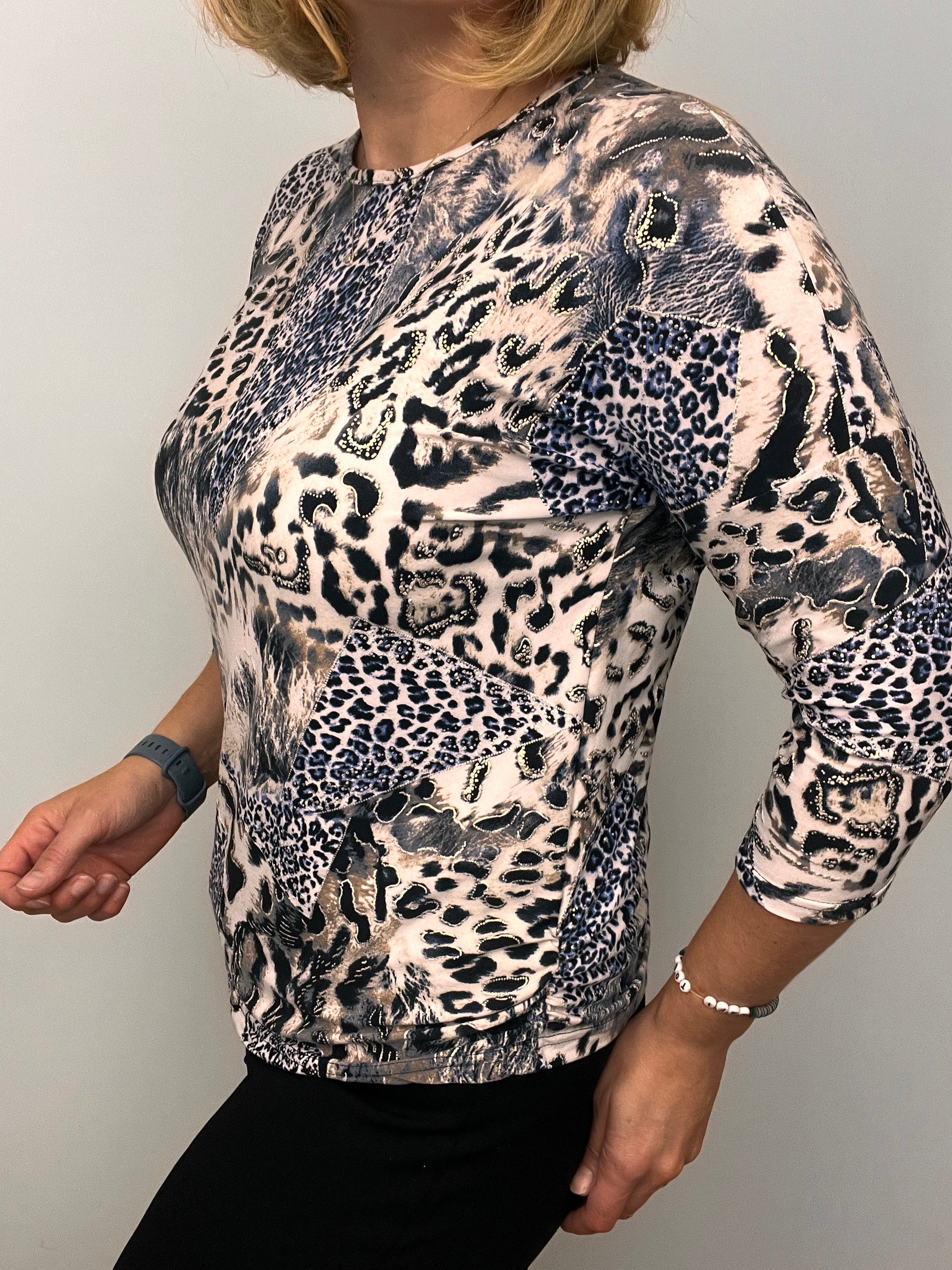 The animal prints are must have this season. The Panther top comes in fantastic combination of black and blue with taupe and golden shiny details through the print. This style is a sister style to our brilliant zip tops. Round neck with dropped shoulder sleeves is an alternative to the zip neckline. This top is ruched at the bottom sides for the perfect fit.